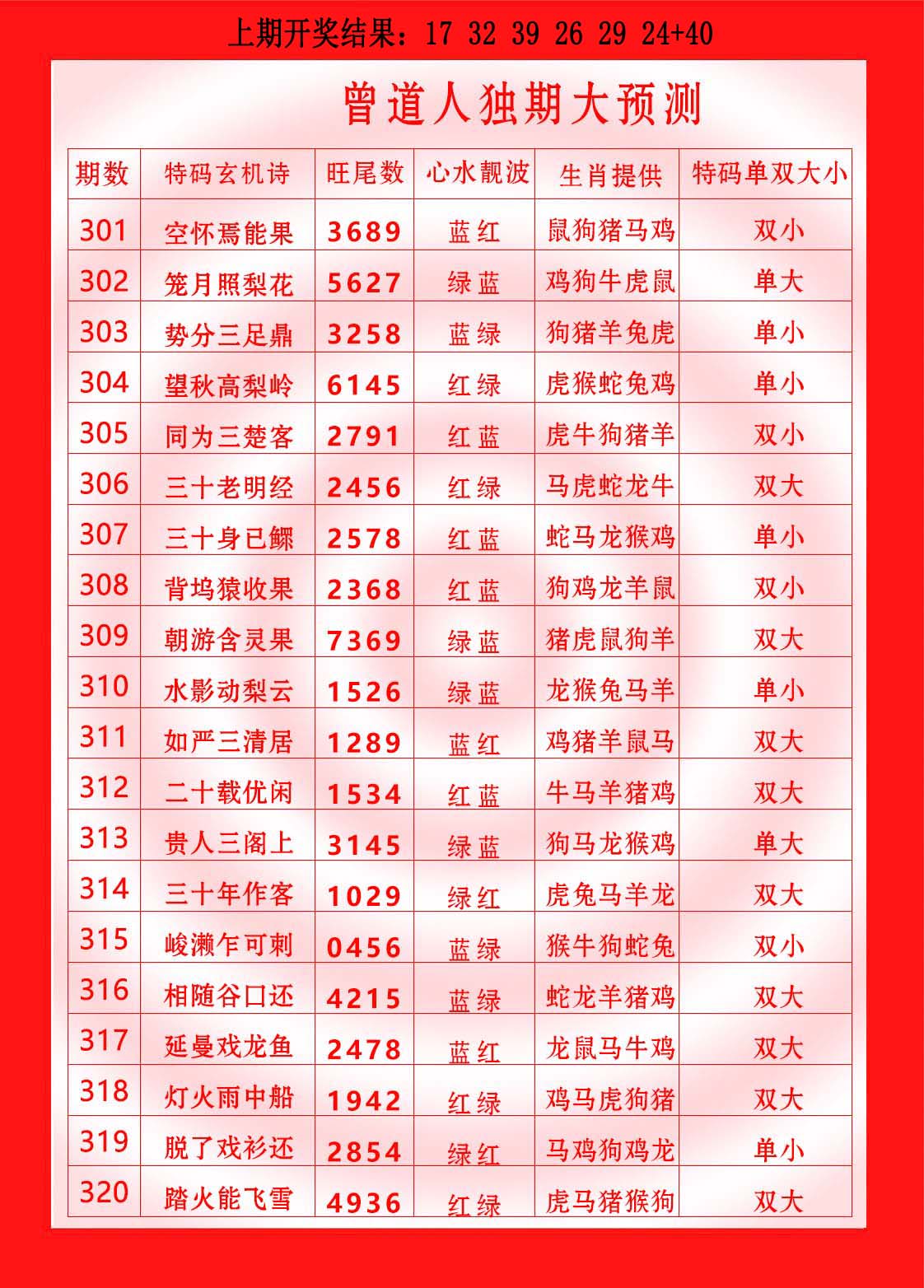 | 300期 | 虎马鸡龙羊狗猴鼠牛 | 开:虎40中 |